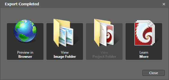 - エクスポートが完了すると、[Export Completed]ダイアログボックスが表示されます。ブラウザでプレビューするには[Preview in Browser]、イメージフォルダを確認するには[View Image Folder]をクリックします。