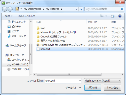 - [メディア ファイルの選択]ダイアログ ボックスで Flash (.swf) ファイルを選択し、[挿入]ボタンをクリックします。