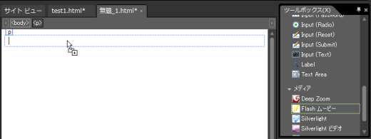 - [ツールボックス]パネルの[メディア]カテゴリ内にある[Flashムービー]を選択してWebページまでドラッグするか、ダブルクリックします。