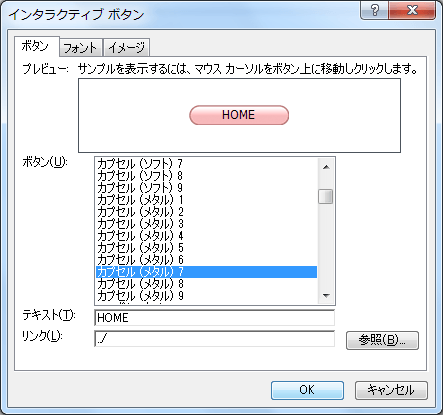 - [インタラクティブボタン]のダイアログボックスが表示されたら、ボタンの種類、テキストを設定しなおして[OK]ボタンをクリックします。
