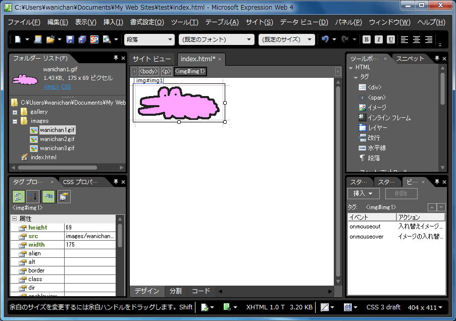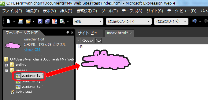 - マウスに触れる前の画像を挿入します。フォルダーリストから画像をドラッグ&ドロップすると簡単です。