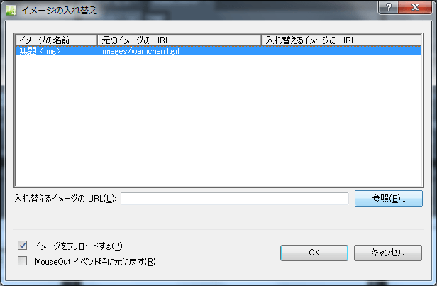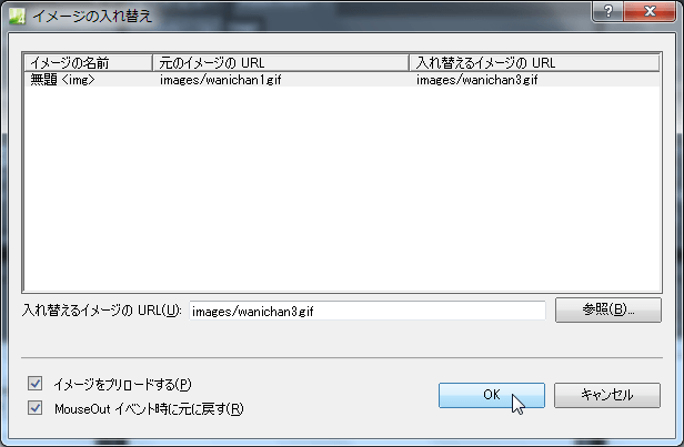 - マウスがその画像から離れたときに元のイメージに戻すには、[MouseOutイメージ時に元に戻す]のチェックを付けて、[OK]ボタンをクリックします。