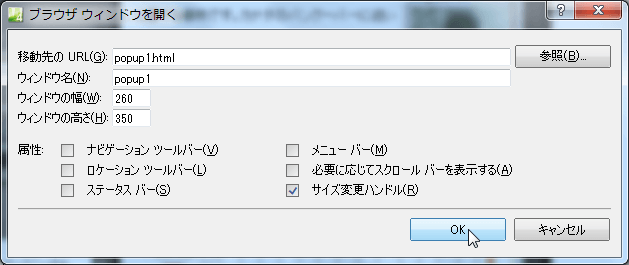 - 必要に応じて[属性]で該当するチェックボックスをオンにします。ここではポップアップサイズ変更できないようにするために、[サイズ変更ハンドル]チェックボックスをオンにします。ここでオンにした項目がブラウザウィンドウに表示されます。