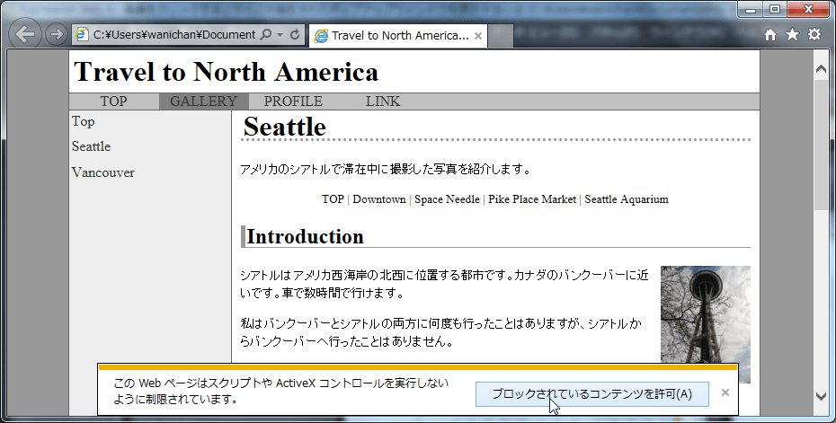 - 上書き保存して[F12]キーを押しブラウザーでプレビューします。既定ではスクリプトやActive Xコントロールがブロックされているので、[ブロックされているコンテンツを許可]するようにしてください。