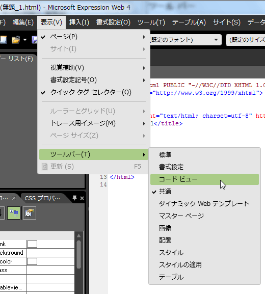 - [表示]メニューの[ツールバー]をポイントし、[コードビュー]をクリックします。