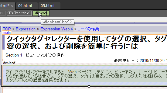 クイック タグセレクターを使用すると、Web ページの[デザイン]ビューまたは[コード]ビューのどちらで作業している場合でも、タグの選択、タグ内の要素だけの選択、タグの削除をはじめ、そのタグブロックの配置を編集できます。