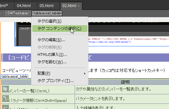 たとえば、対象となるテーブルの要素全体を選択してセルのプロパティを表示したい場合は、クイックタグセレクターの<table>ボタンの▼をクリックして、[タグコンテンツの選択]をクリックします。