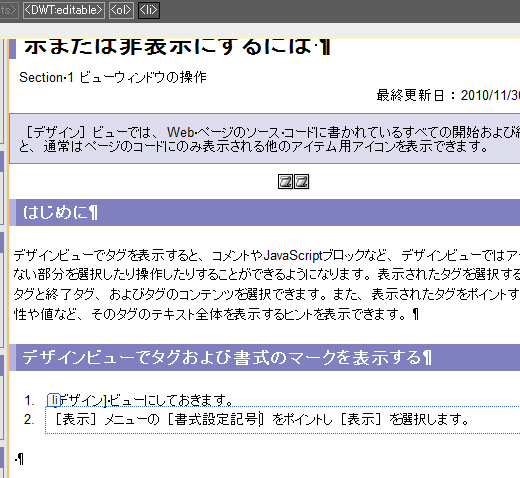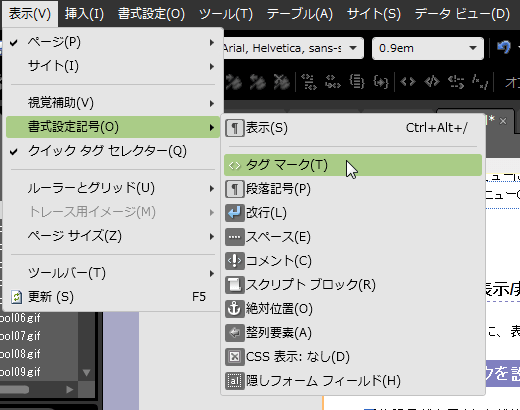 デザインビューでタグおよび書式のマークを表示する