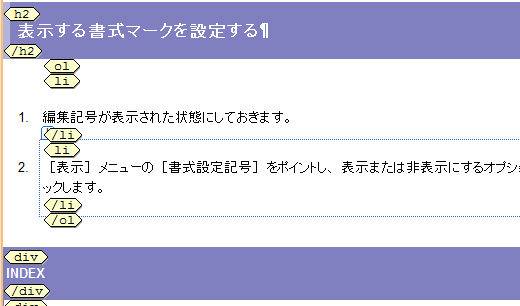 - [表示]メニューの[書式設定記号]をポイントし、表示または非表示にするオプションをクリックします。ここでは、[タグマーク]を表示するようにクリックします。