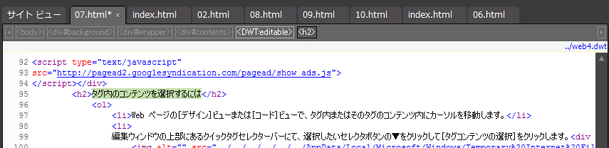 タグに囲まれたコンテンツを選択するには、クイックタグセレクターを利用します。