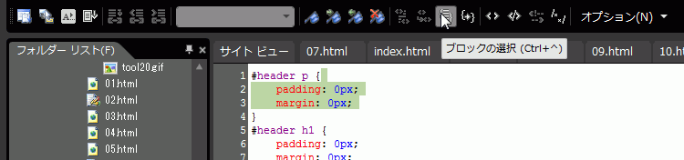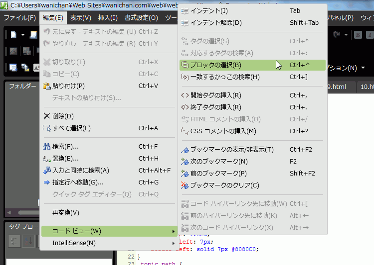 - [編集]メニューの[コードビュー]をポイントし、[ブロックの選択]を選択します。