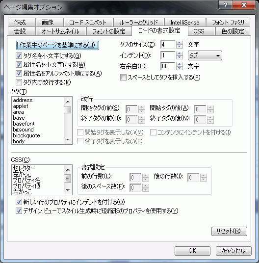 - [ページ編集オプション]ダイアログボックスの[コードの書式設定]タブを開きます。