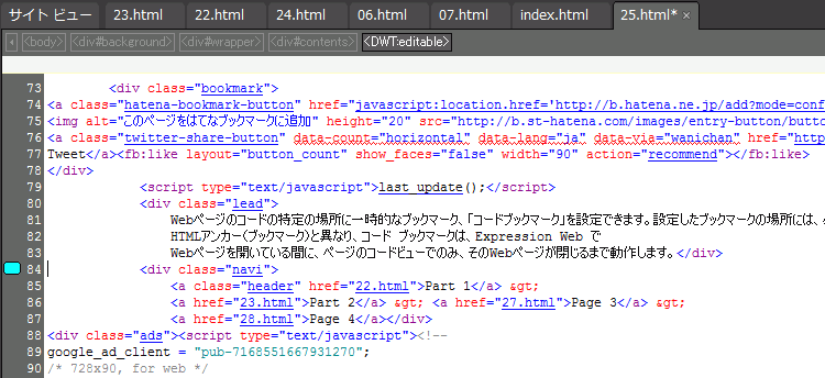 Webページのコードの特定の場所に一時的なブックマーク、「コードブックマーク」を設定できます。設定したブックマークの場所には、必要なときに簡単に戻ることができます。ハイパーリンクで参照できる HTMLアンカー(ブックマーク)と異なり、コード ブックマークは、Expression Web で Webページを開いている間に、ページのコードビューでのみ、そのWebページが閉じるまで動作します。