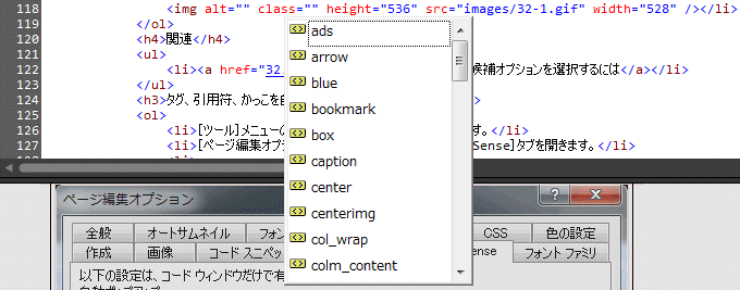 - <img>タグ内にスペースを入れることによって、属性のIntelliSenseのショートカットメニューが表示されます。