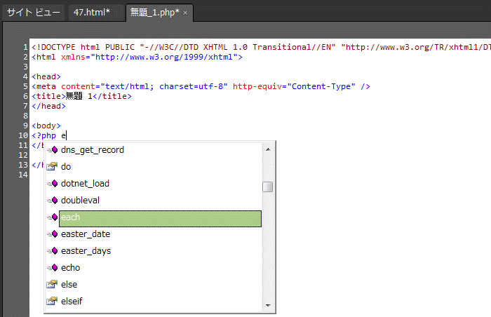 HTMLやCSSといったコード編集の場合はIntelliSenseのショートカットメニューが自動的に表示されますが、PHPではCtrlキーを押しながらLキーを押さない限り表示されません。頭文字を入力してCtrlキーを押しながらLキーを押すことによって、効率的に関数の挿入が行えます。