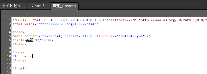- PHPページでコードビューに切り替えて、PHP を作成する場所にカーソルを置きます。