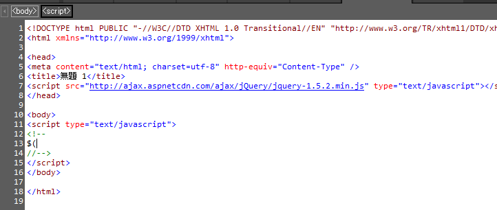 - [コード] ビューに表示している Web ページまたは外部 .js ファイル内で、jQuery を作成する位置にカーソルを置きます。