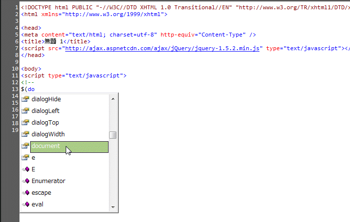 - jQuery セレクターの IntelliSense ショートカット メニューを表示するには、「$(」または「jquery(」と入力します。