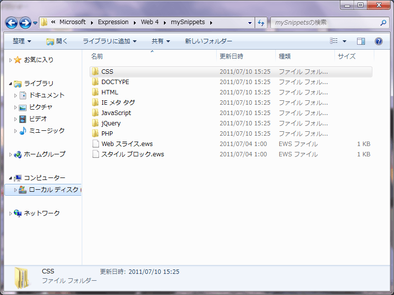 Windows 7の場合、スニペットパネルの情報は以下の場所を参照しています。それぞれのスニペットは、EWS ファイル(たぶんExpression Web Snippets の頭文字をとった拡張子)で構成されています。