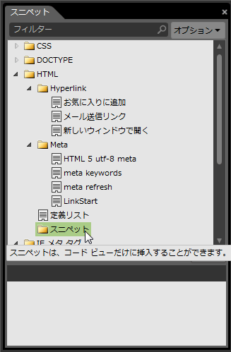 - スニペットパネルの右上の[オプション]をクリックし、[新しいスニペット]をクリックします。