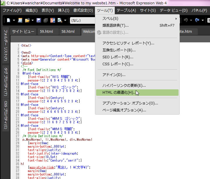 - [ツール]メニューの[HTMLの最適化]をクリックします。