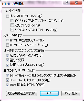 現在作業中のWebページのHTMLを最適化するには、[HTMLの最適化]ダイアログボックスを表示し、除去したいものにチェックを入れて実行します。
