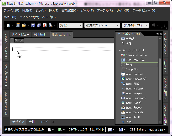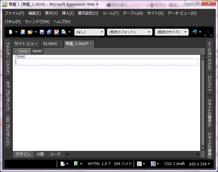 ツールボックスからFormをダブルクリックすることによって、formタグがWebページに挿入されます。ただし、作成時のエンコードタイプに注意が必要です。
