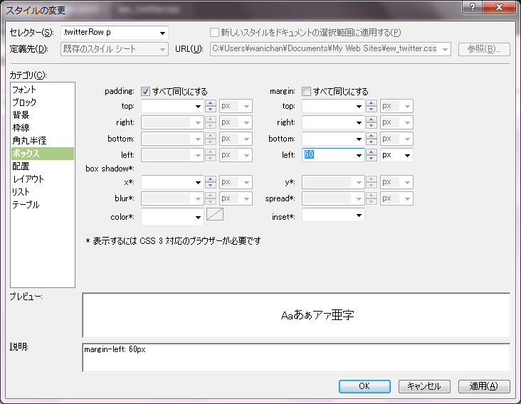 .twitterRow p を右クリックして、ショートカットメニューより[スタイルの変更]をクリック