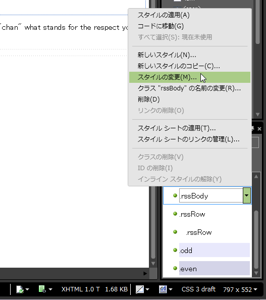 - [スタイルの適用]パネルから「.rssBody」を右クリックして、ショートカットメニューより[スタイルの変更]をクリックします。