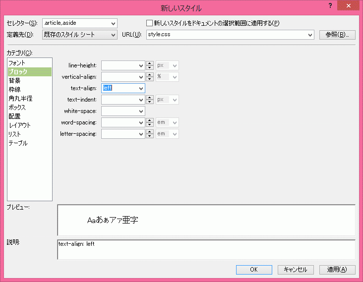 - [ブロック]タブを選択し、[text-align]プロパティを[left」にします。