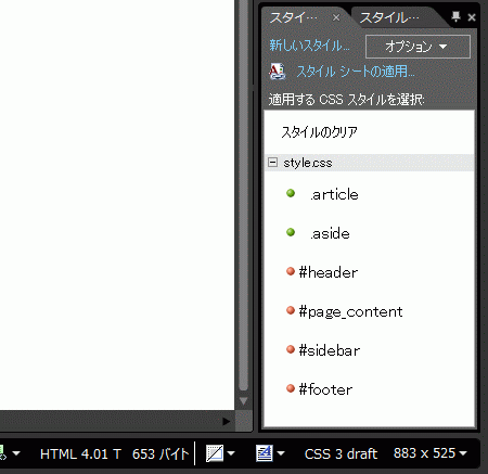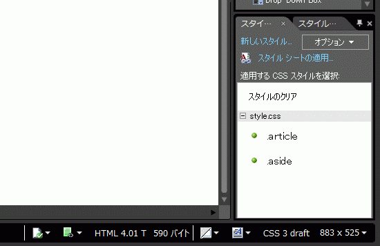 - [スタイルの適用]パネルに .article と .aside のスタイルが style.css 内に表示されました。