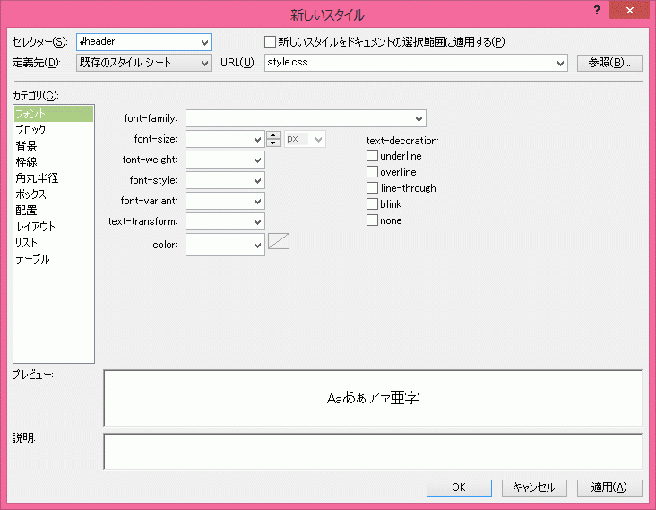 - [定義先]では[既存のスタイルシート][style.css]が指定されていることを確認して、[OK]ボタンをクリックします。