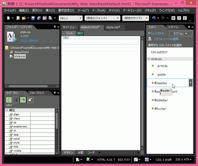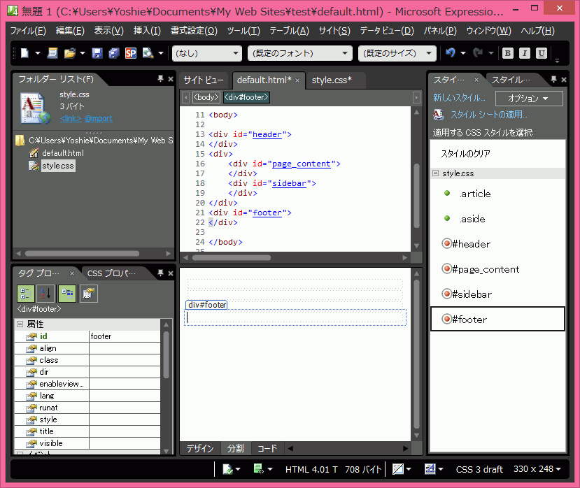- そのほかのDIVも同様にスタイルを適用していきます。ただし、下の図のように、#page_contentと#sidebarはDIV内のDIVに適用します。