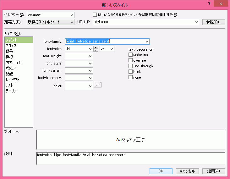- 必要に応じてスタイルを指定します。ここでは、フォントサイズなどを指定して[OK]ボタンをクリックします。