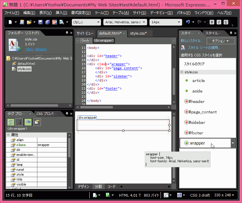 - #page_content と #sidebar を囲むDIVを選択して、[スタイルの適用]パネルの[.wrapper]を選択します。
