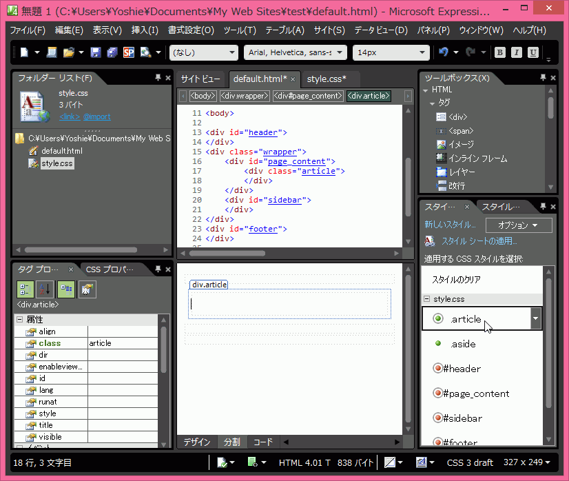 最後に、#page_content のDIV内に .article スタイルが適用されたDIV、#sidebar のDIV内に .aside スタイルが適用されたDIVを挿入します。