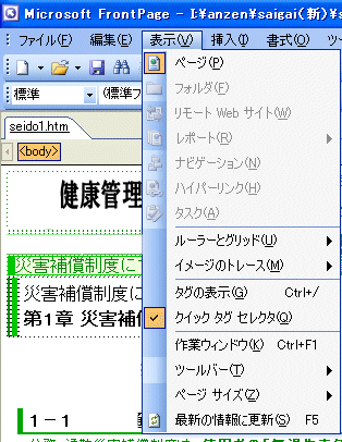 普段も、ブラウザで表示させて「表示」→「ソース」で直接htmlソースをいじる方法を使うことが多いです。Frontpageを使うのは、文章を打ち込んだり色を変えたりする程度しか使っていません。