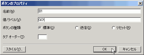 ボタンのプロパティが表示されますので、値/ラベルを「GO!」に指定しなおしてOKボタンをクリックします。