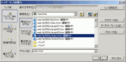 このボタンを押して、設定したい部分上にマウスで指定すると、ハイパーリンクの挿入ダイアログボックスになります。 (ホットスポットの強調表示)