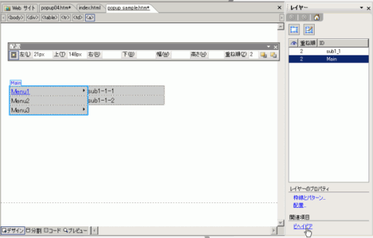 レイヤーの一覧の中からいずれかを選択すると、デザインビューでどの部分であるか確認することができます。