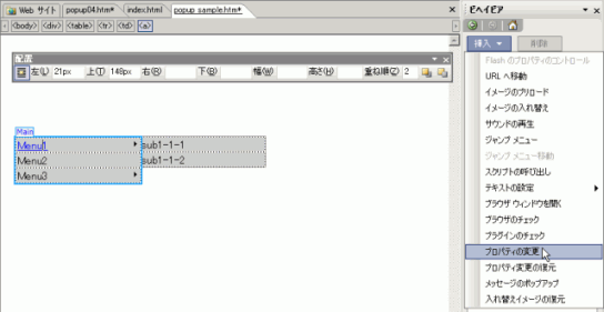 メインメニューのリンクが設定されている文字部分にカーソルを置き、クイックタグセレクタで「<a>」が選択されていることを確認し、作業ウインドウ下部の [ビヘイビア] をクリックします。