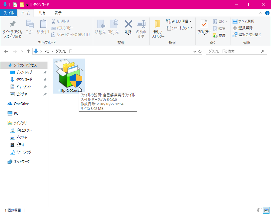 - ダウンロードフォルダーを開くと、FFFTPの自動解凍実行ファイルがあるので、そのファイルをダブルクリックします。